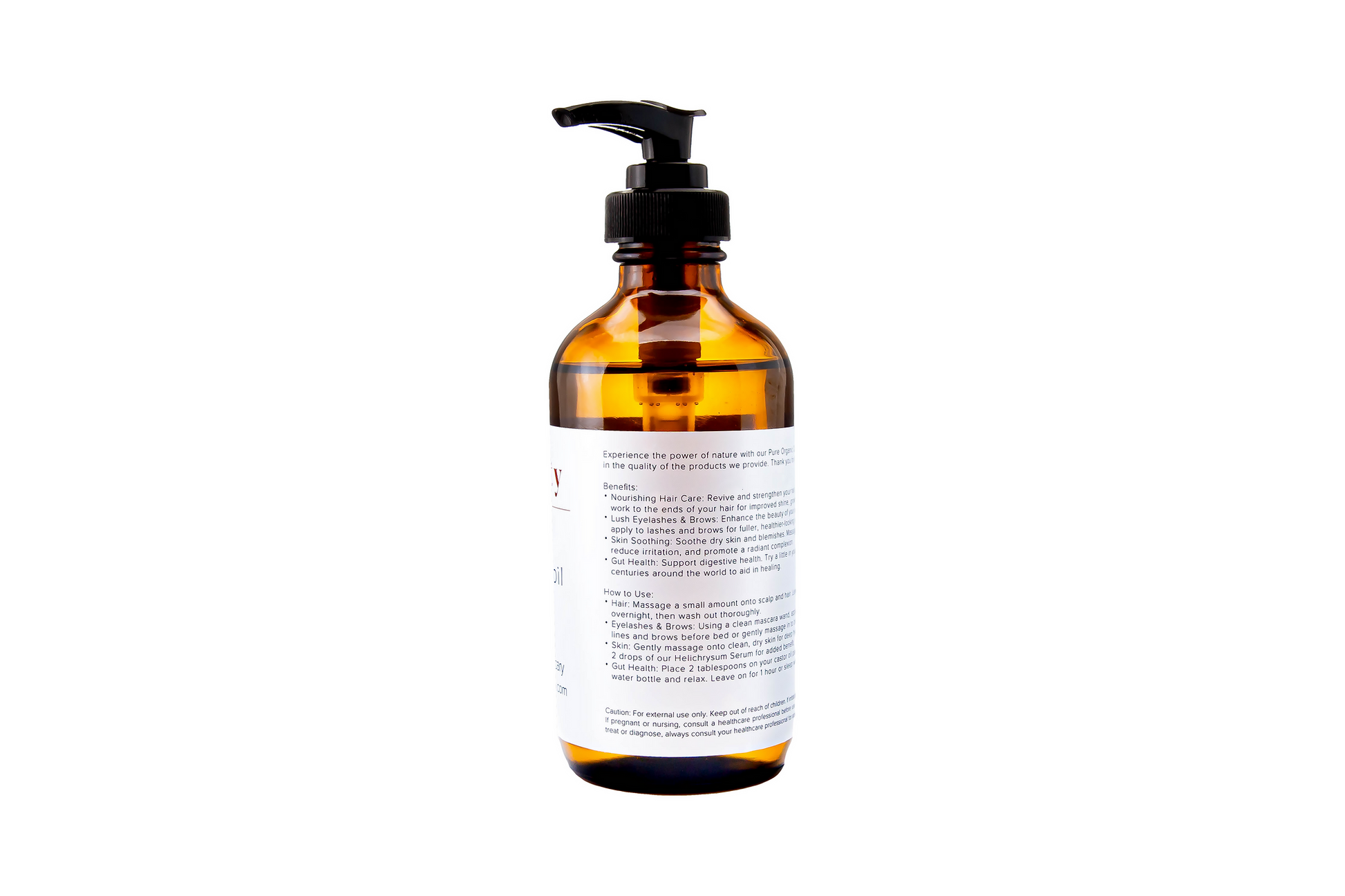 Organic cold-pressed hexane-free castor oil in glass amber 8oz bottle.